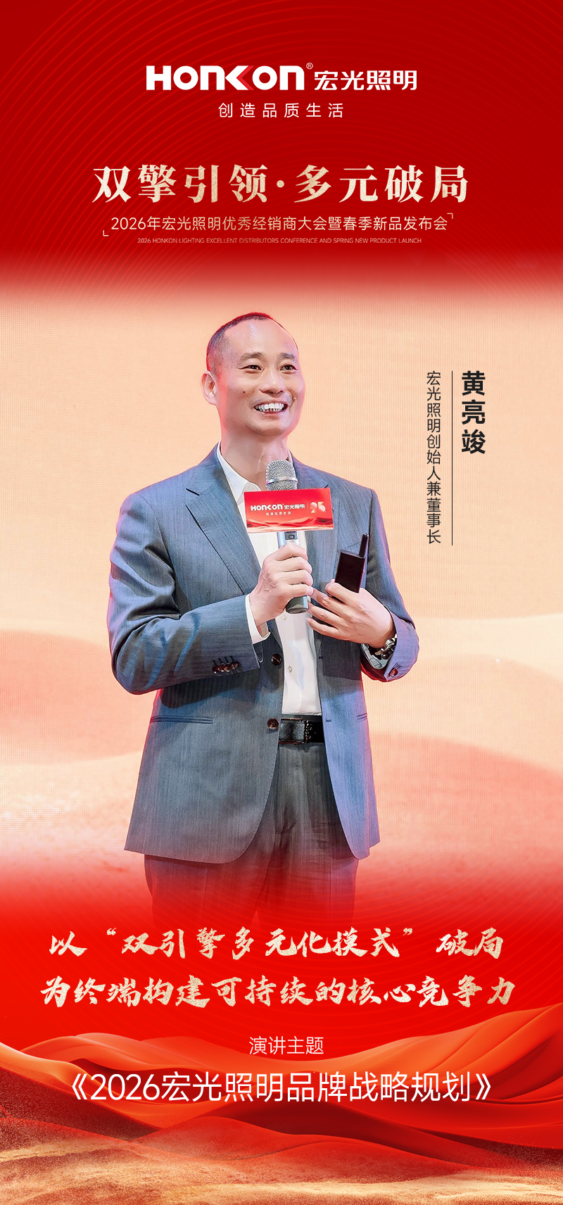 随着会议议程进入核心战略发布环节,凯发k8一触即发照明创始人兼董事长黄亮竣上台致辞,首先向全国经销商家人们致以诚挚感谢。正是大家长期以来的信任与支持,携手共创,才共同铸就了凯发k8一触即发今天的口碑与市场基础。面对当下行业“内卷”加剧,市场普遍陷入产品、店态、品牌、服务全维度同质化的竞争困局,单靠产品力已经很难真正突围。要走出困境,必须依靠一套更系统、更可复制、能持续拉开差距的经营模式。