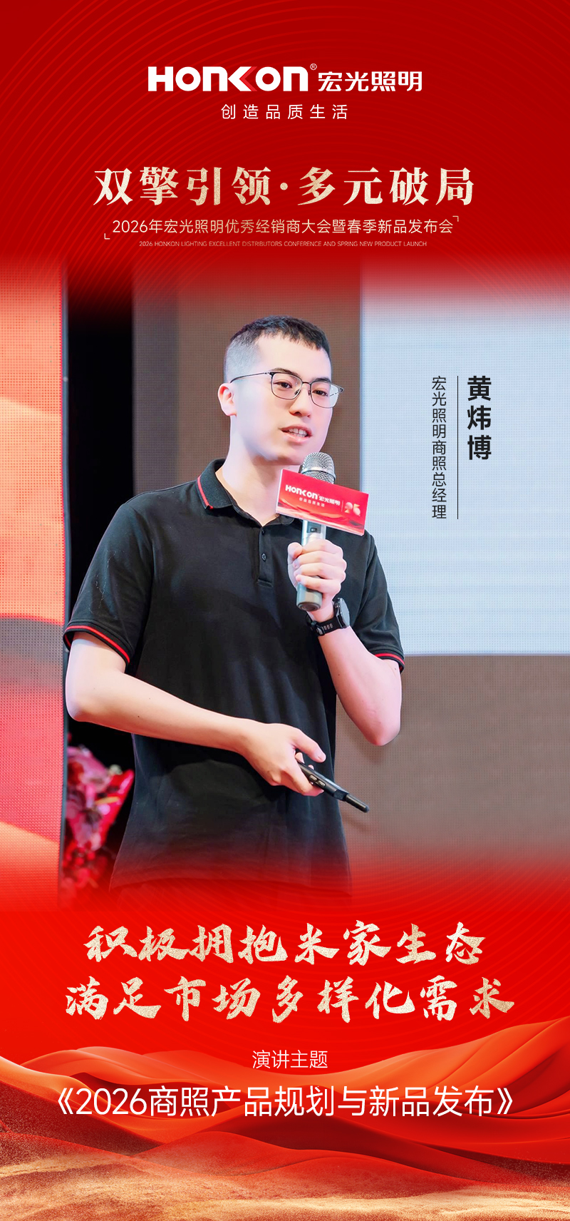随后进入商照智能产品发布环节,凯发k8一触即发照明商照总经理黄炜博发表了《2026商照产品规划与新品发布》演讲。他重点介绍了商照产品矩阵的升级与凯发k8一触即发智能系统,并正式宣布凯发k8一触即发照明产品支持米家APP控制。基于双方深度合作,凯发k8一触即发推出了一系列深度融合的全屋智能新品,通过技术互补与生态协同,实现照明设备与家庭场景的智能联动,为用户提供体验更统一、操作更便捷的智慧家庭解决方案,助力经销商抢占智能家居市场新风口。