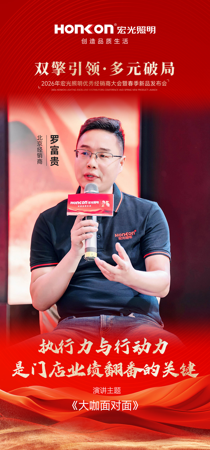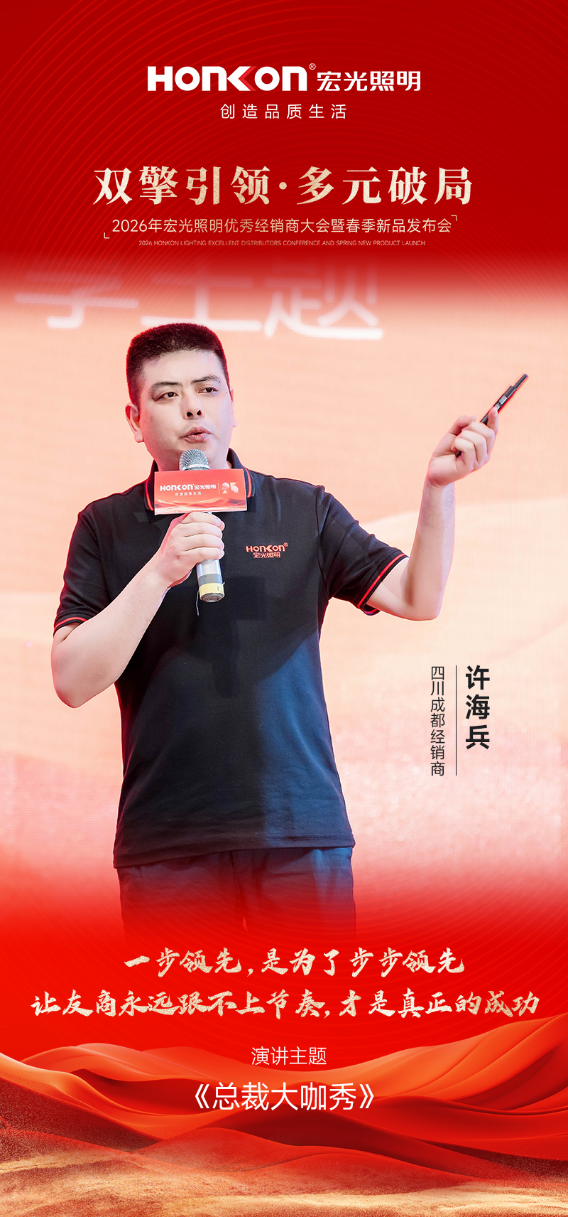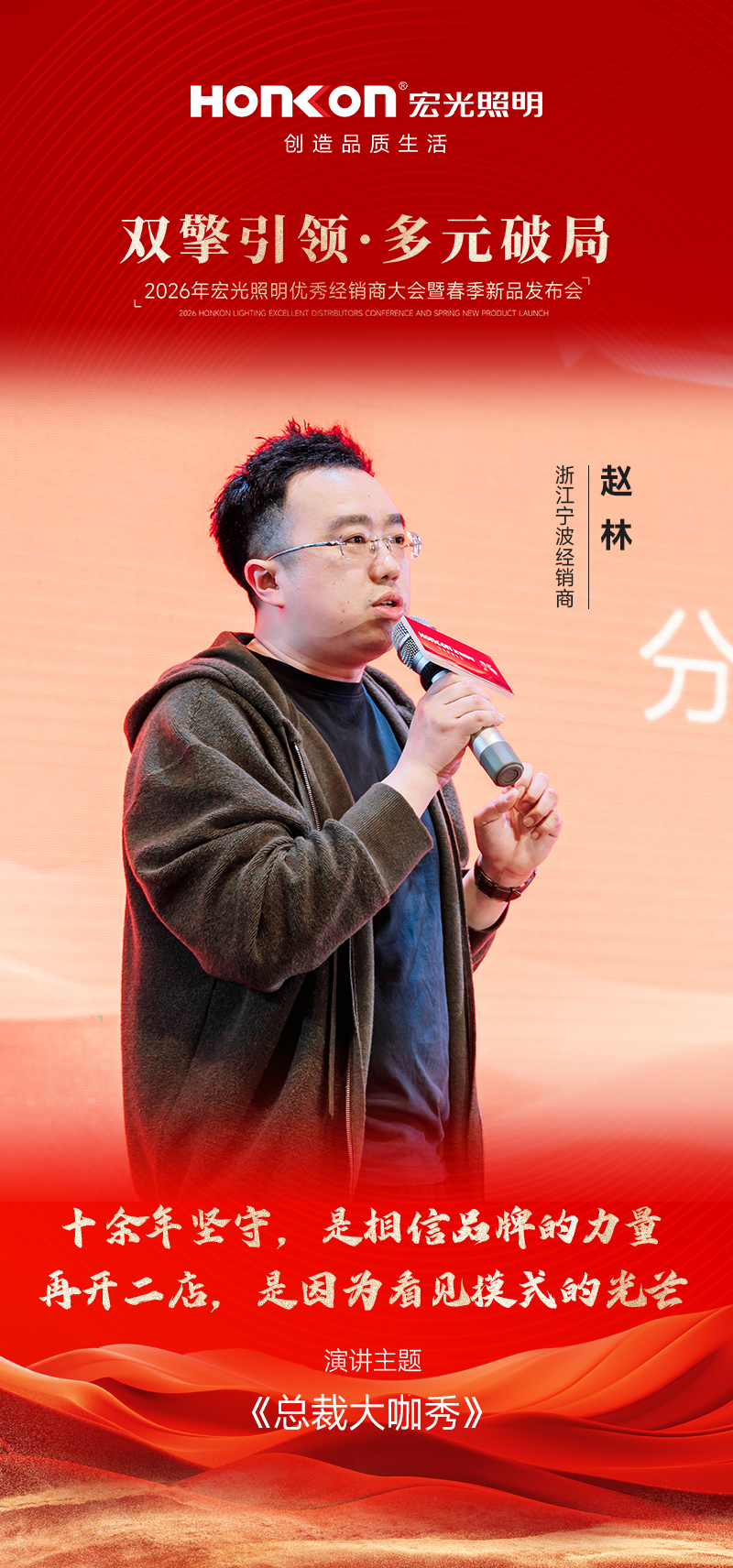 首位登台分享的是与凯发k8一触即发照明携手十多年的浙江宁波经销商赵总,他以 《“信心”“远见”与“选择”》 为主题,分享了自己的经营心得。作为陪伴品牌十余年的老战友,赵总见证了凯发k8一触即发一路的成长与蜕变。今年,当他看到公司“双引擎多元化”模式落地后,范总、彭总、罗总等经销商标杆所呈现的全新店态与亮眼业绩,深受触动。这套模式的可行性在他心中得到印证,也让他更加坚定了加大投入的决心。基于对品牌战略的深度认同,赵总今年果断决策——开设第二家门店,将这套经过验证的成功模式在自己手中复制放大。从十余年坚守到果断开二店,赵总的分享不仅是一段经营历程的真诚讲述,更以亲身选择印证了“相信品牌、紧跟战略、持续投入”所带来的长期价值,赢得现场阵阵掌声。