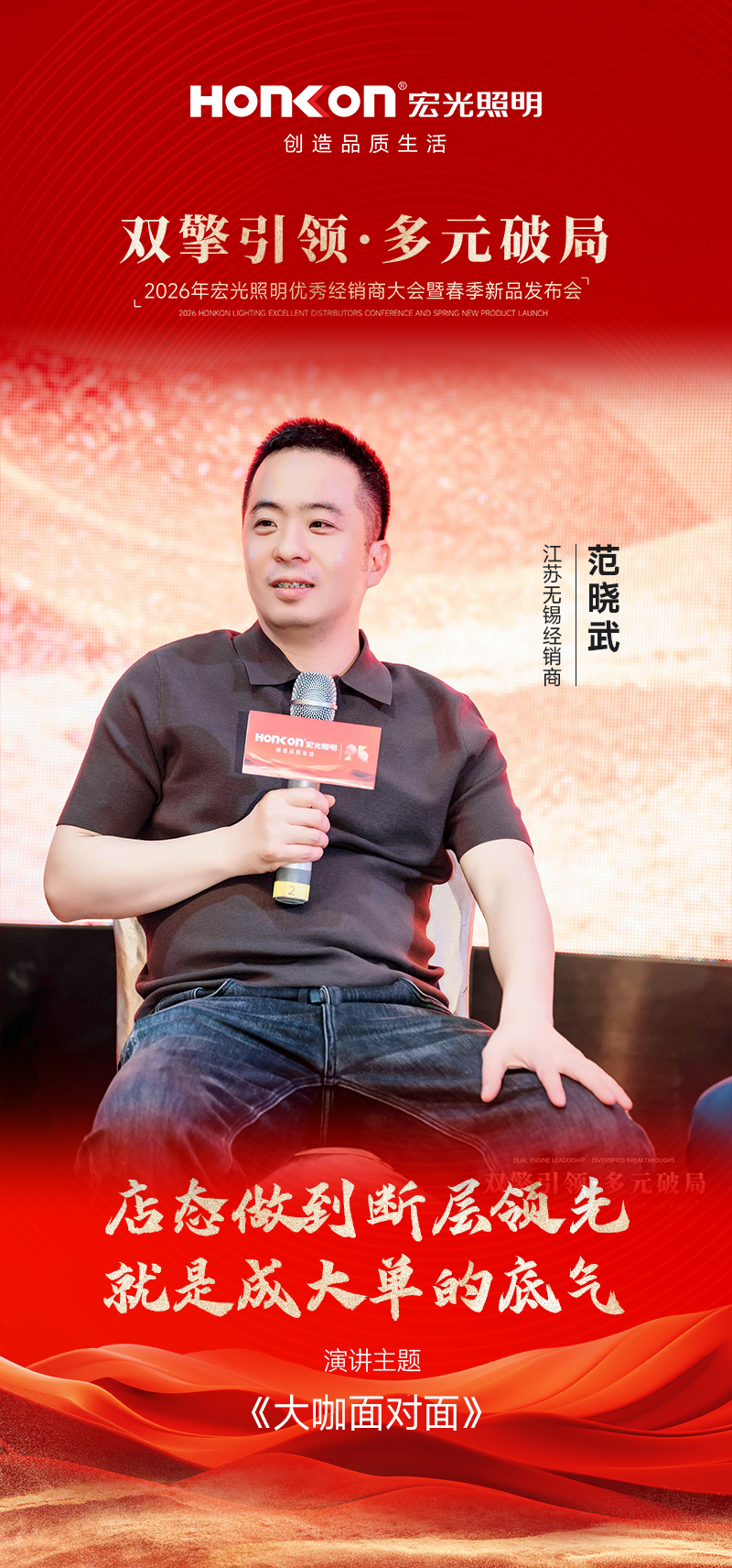 无锡经销商范总作为凯发k8一触即发照明首个落地“双引擎多元化”模式、率先开设二店的先行者,在圆桌交流中分享了自己的实战心得。他始终坚定相信凯发k8一触即发品牌,致力于将凯发k8一触即发打造为当地市场的标杆,与竞争对手形成明显区隔。“店态输出必须做到断层领先,让客户一进店就能感受到不一样。” 范总强调,当门店呈现足够惊艳、场景足够沉浸,客户的信任感与购买欲自然被激发——更容易成单,也更容易成大单。正是凭借这份先行者的魄力,他在市场低迷期实现业绩逆势增长,将门店真正打造为区域标杆。范总的分享,以破局者的姿态印证了“双引擎多元化模式”在终端的强大爆发力。